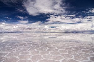 Localizat in Anzi, este cel mai mare desert de… sare, candva parte din preistoricul lac sarat Lago Minchin, care acoperea cea mai mare parte din sud-vestul Boliviei. Cand lacul a secat s-au format portiuni vaste de sare, desertice, luand nastere salina la suprafata, Salar de Uyuni. Zona, care are mai bine de 12.000 de kilometri patrati, este acoperita cu sare alba si o pelicula foarte subtire de apa, in sezonul ploios, formand cea mai mare oglinda naturala a lumi.